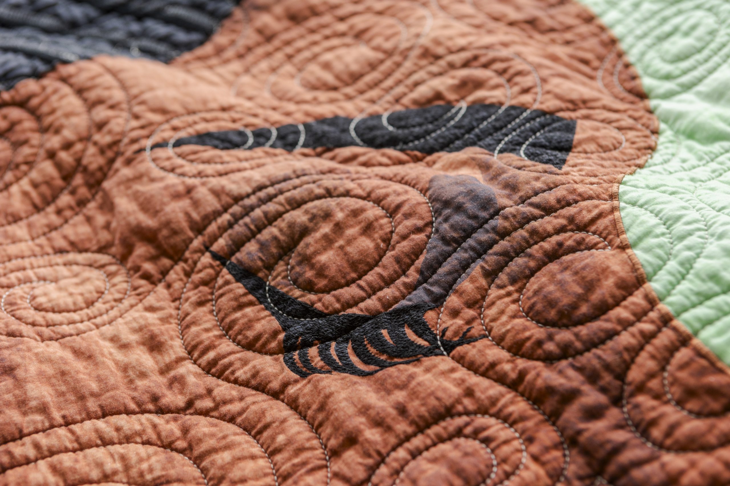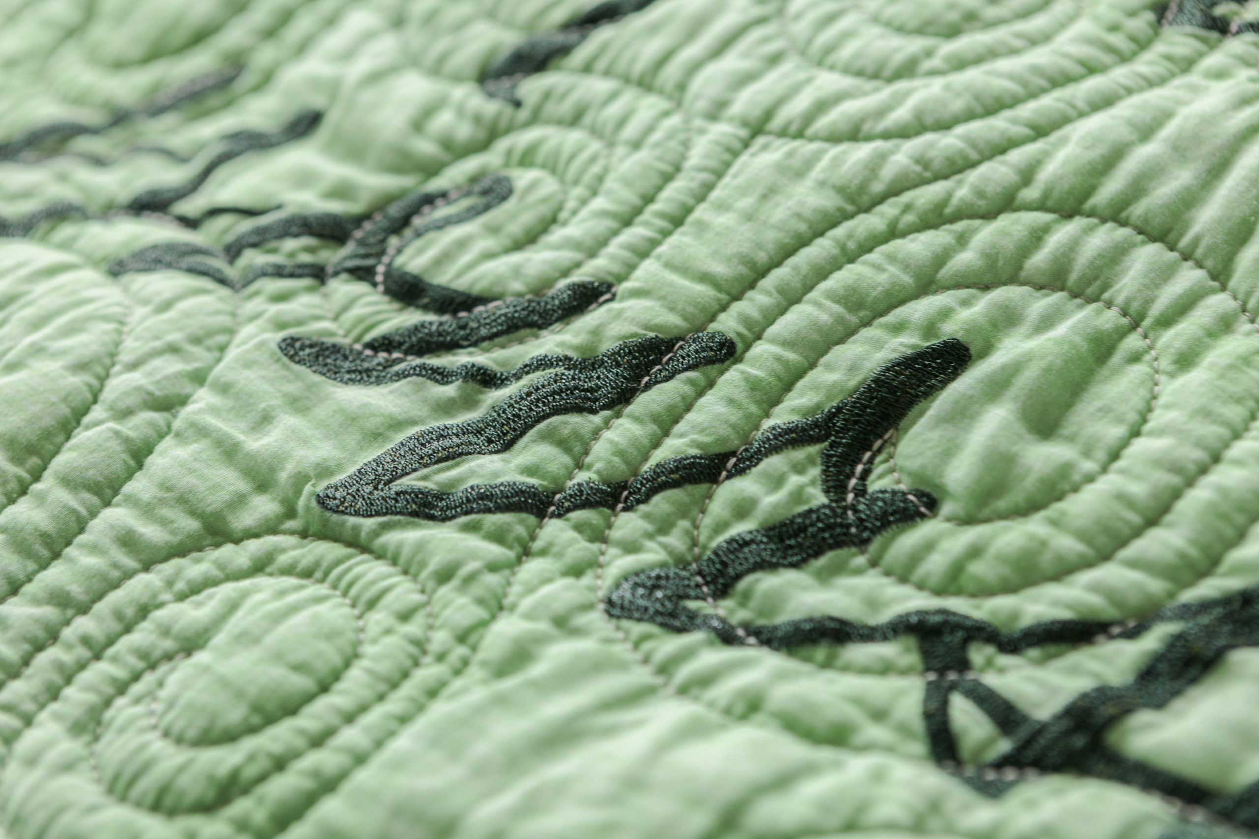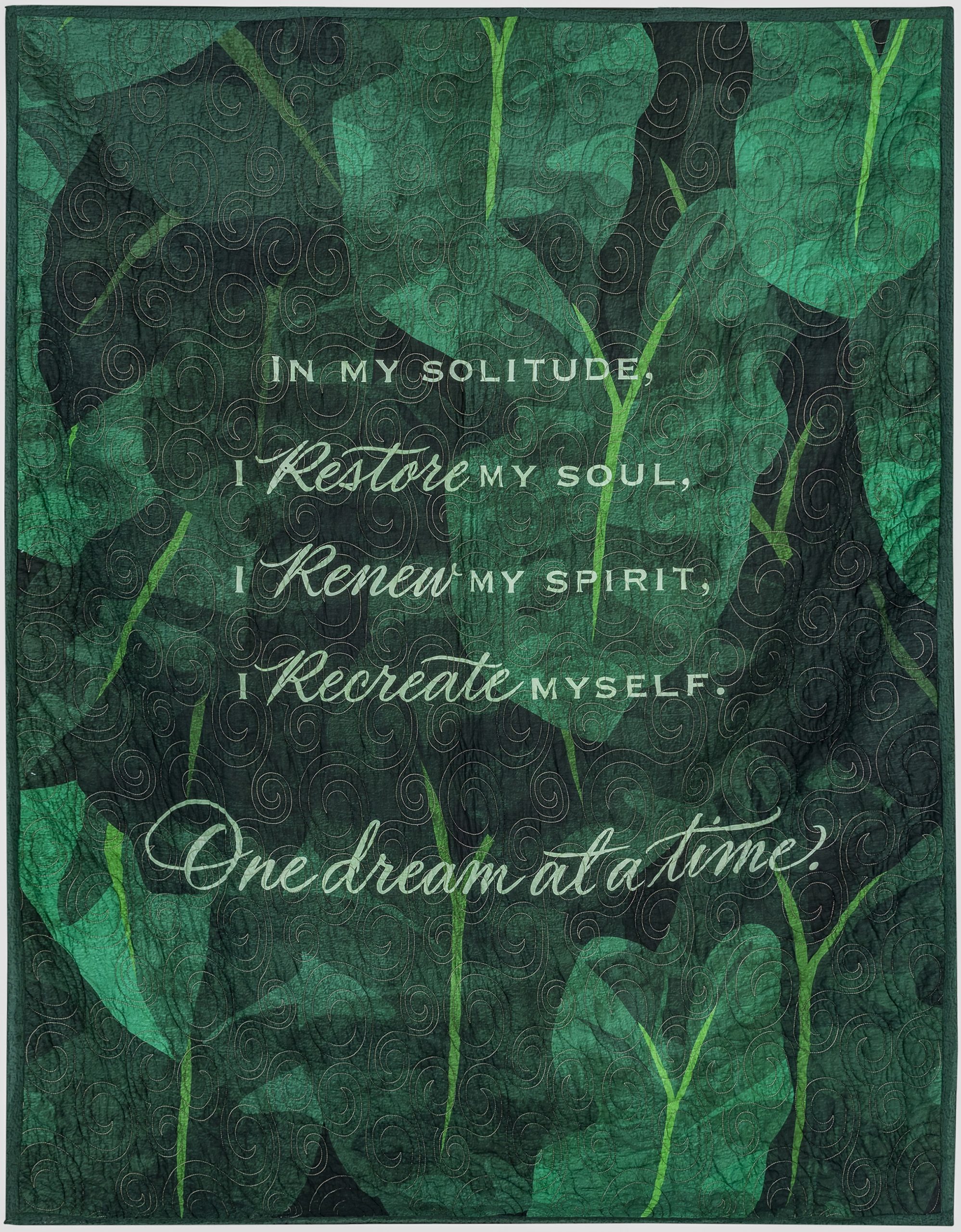 The rich green tones throughout the quilt symbolize life, renewal, and personal growth. Embroidered details—braided hair, closed lashes, soft lips, golden earrings—bring the art to life, while swirling stitches mimic the rhythm of breath and quiet transformation.
